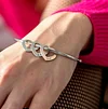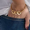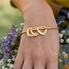 Treat yourself or someone special to a beautiful personalized bracelet! Our Bangle Bracelet with Heart Shape Pendants is just right for celebrating love, friendship, and family. Designed to be worn on its own or stacked with other bracelets, this gorgeous piece features a simple bangle adorned with open hearts , each inscribed with the name, nickname, or inspirational word of your choice.