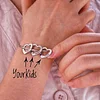 This sleek bracelet is adorned with open heart charms, each inscribed with the name or meaningful word of your choice.